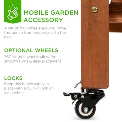 Keeping a garden has always come with a few challenges, and the right equipment goes a long way toward making your garden bloom. This Garden Bench is the mobile garden accessory that will help you keep a clean space, and manage your many projects. This bench comes with ample storage in the form of upper shelves, tool hooks, and a lower compartment for a total of 8 sqft of storage. This bench features an expanding table top and a non toxic mixing tub; access your sink anytime or cover it up and enjoy a sturdy workspace. The non-toxic tub prevents plants from contamination and protects soil/fertilizer. Close your table top when you’re done for the day to hide/protect work in progress. Pre-stained for longevity, a water-based stain protects your bench from rotting, discoloration, and sun damage. Best of all, you have the option of mobility. A set of four wheels let you move this bench from one project to the next; 360-degree wheels allow for smooth turns & easy placement. Keep this bench safely in place with a built-in lock on each wheel. This garden bench is the essential tool of the home gardener. Product Specifications: Overall Dimensions (with wheels): 39.5″(L) x 18″(W) x 58.25″(H), Overall Dimensions (Open) 58″(L) x 18″(W) x 58.25″(H)