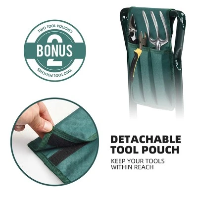 No more hurting your knees or staining your clothes in gardening activities, our garden kneeler and seat enables you to accomplish gardening tasks in comfort and ease. Softly padded with EVA foam, it greatly reduces pressure on your joints, so that you can work in a comfortable state for longer periods of time. Heavy-duty steel frame ensures its stability and durability. Innovative 2-in-1 design allows it to be converted from a kneeler into a seat in a matter of seconds. Just flip it over, and then you can trim branches comfortably on the seat or take a rest when getting tired. Besides, this garden kneeler is equipped with 2 detachable tool pouches, where you can keep all your tools within reach. With its folding design and a weight of just 6lbs, this garden kneeler is super easy to store and carry. Don’t hesitate to buy one! . Specification: Color: Green. Material: EVA Foam + Steel. Net Weight: 6 lbs. Overall Dimension: 23”(L) x 11”(W) x 20”(H) . Folded Size: 23”(L) x 11”W) x 5”(H) . Size of Cushion: 16”(L) x 6”(W) . Weight Capacity: 330 lbs. . Package includes:. 1 x Garden Kneeler.