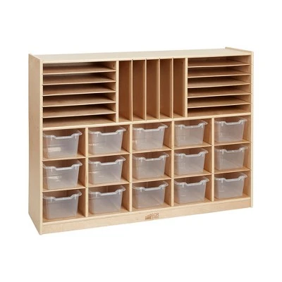 - This durable wooden storage cabinet with 15 cubbies, 15 plastic bins, 12 shelves, and 5 vertical display shelves provides plenty of storage for schools or homes