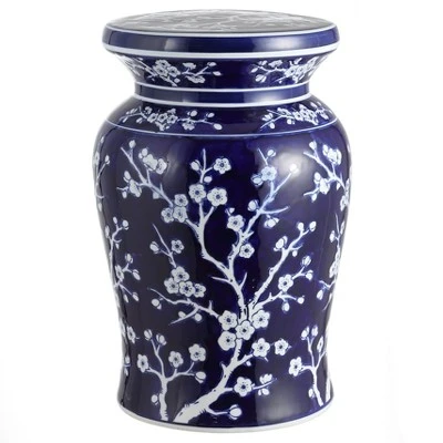 Always chic, deep blue Chinese porcelain never goes out of style. Our urn-shaped ceramic garden stool is decorated in a classic cherry blossom pattern. Use them indoors or out as a side table, garden seat, or plant stand.