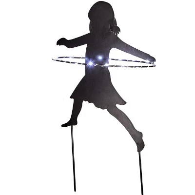 Add a playful touch to your yard with this garden décor. These lawn ornaments are available as boy or girl silhouettes. Around the waist of each child silhouette, there’s a solar lighted hoop with 17 LED lights. This outdoor décor lets you select between two light functions: flashing and constant on. Since this yard décor is solar lighted with no need for batteries or wiring, installation is easy. Just push it into the ground and let the sun do the work. 8-1/4″W x 4″D x 16″H, including the approx. 6-3/8″L ground stake. Metal.